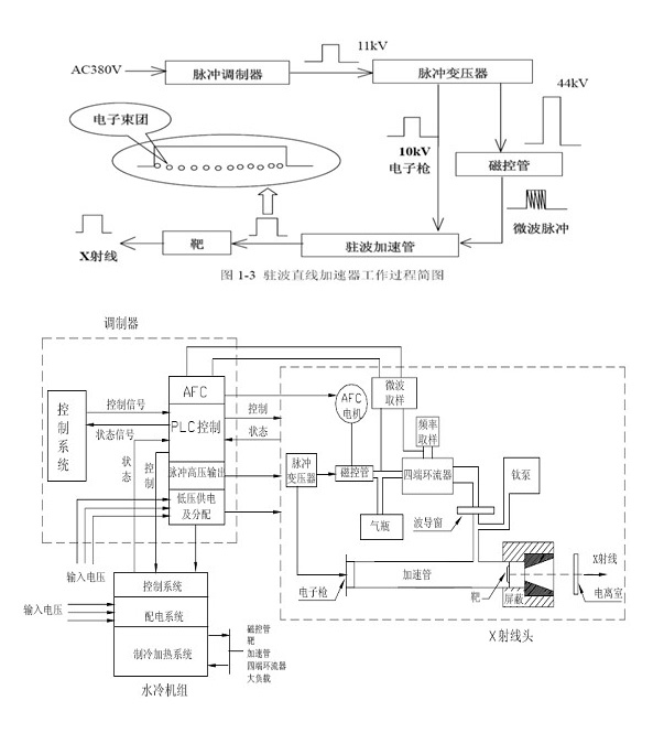 1、(1)脈沖調制器將市電轉變成高壓脈沖。(2)高壓脈沖通過一個脈沖變壓器為磁控管供電。(3)磁控管產生工作頻率為2998MHz的射頻微波,該微波功率經過波導系統及波導窗饋入駐波加速管中,微波饋入加速管以后在加速管中形成正向波和反向波,兩者疊加形成駐波(頻率和振幅均相同、振動方向一致、傳播方向相反的兩列波疊加后形成的波。波在介質中傳播時其波形不斷向前推進,故稱行波;上述兩列波疊加后波形并不向前推進,故稱駐波)。
