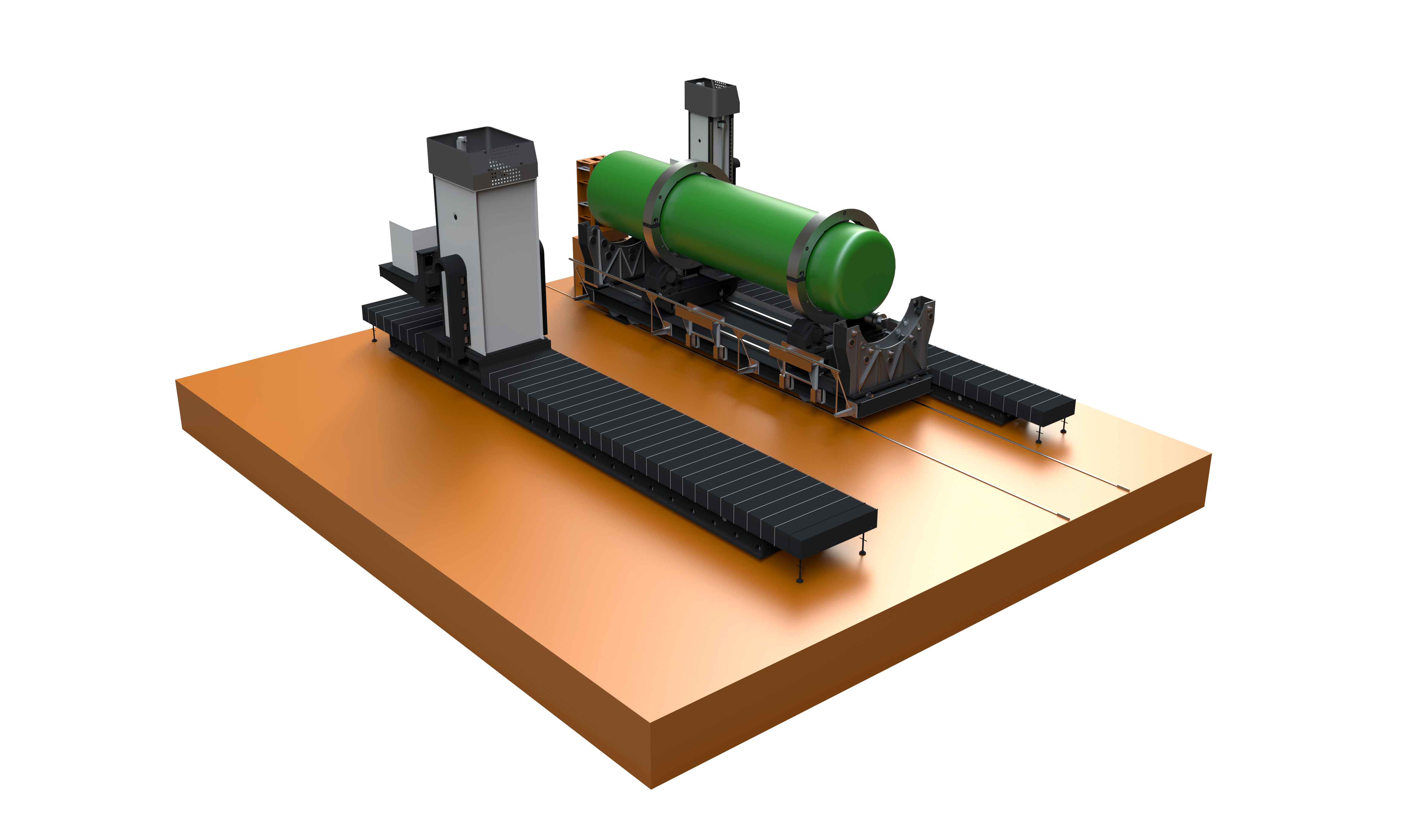 該臥式CT檢測系統采用高精度機械裝置,承載被檢測工件、射線源、探測器,并實現工件自動加載、卸載以及CT掃描運動。該系統的突出特點是:在廠房外工件裝載區,完成工件自動裝載,由RGV(Rail Guided Vehicle)轉運至廠房內指定位置,同時保證高度方向一定的水平度和重復定位精度。加速器、探測器和物體之間的位置關系,通過測距及自動控制等方式進行調整,以滿足CT對三者位置關系的嚴苛要求。檢測過程中無需操作人員進入檢測室,只需在控制室通過計算機操作,控制掃描裝置系統的多軸運動,配合軟件系統,即可實現自動化、智能化的高精度掃描成像。